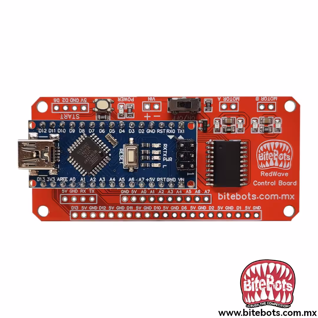 La Red Wave es una tarjeta de control versátil diseñada para proyectos de robótica como robots de combate, minisumo, seguidores de línea, resuelve laberintos y más. Equipada con un Arduino Nano, permite gestionar múltiples dispositivos gracias a sus 6 pines digitales de E/S y 8 entradas analógicas.